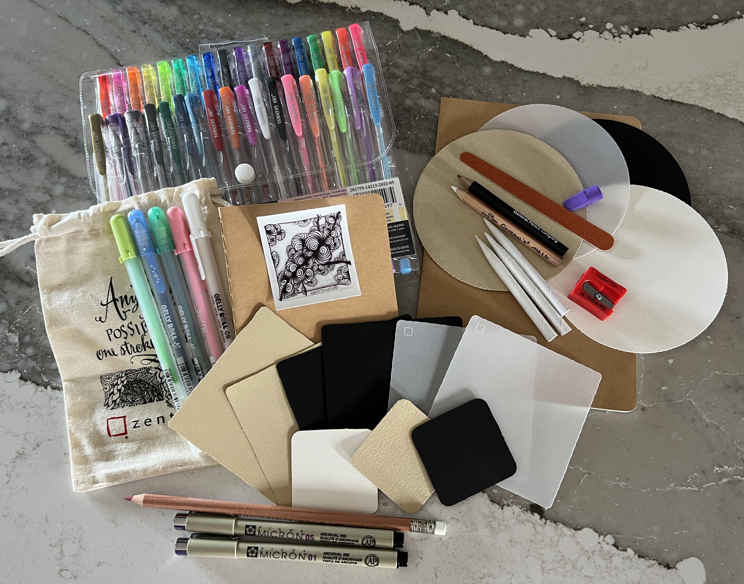 A small gratitude sticker by Jessica. As well a recorded Zentangle class free! Remember colors of pens may vary. Value over $200 AND